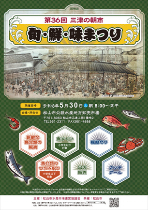 第36回三津の朝市「旬・鮮・味まつり」は令和8年5月30日(土)に開催します。
