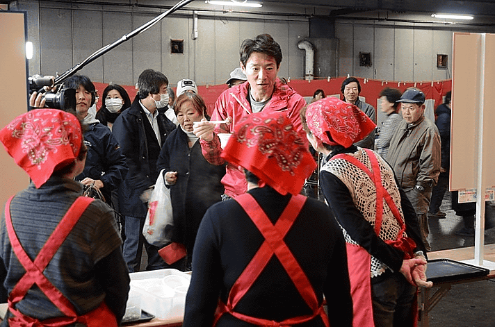 | 佐智子さんから三平さんへ「アーンして」 | めで鯛使・市長から 「みなさんも食べてください」 |