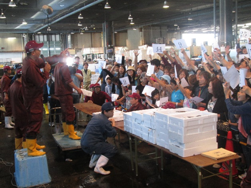新鮮な鮮魚を求めて、毎回行列が出来ます。 |